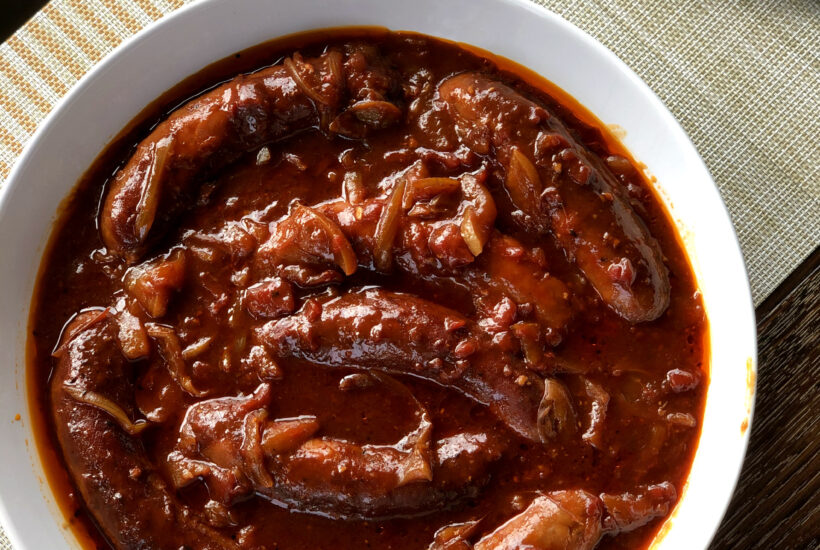Slow Cooker Devilled Sausages is a hearty and easy dinner made with sausages, onion, beef stock and tin tomatoes, slowly cooked into a rich, comforting meal.