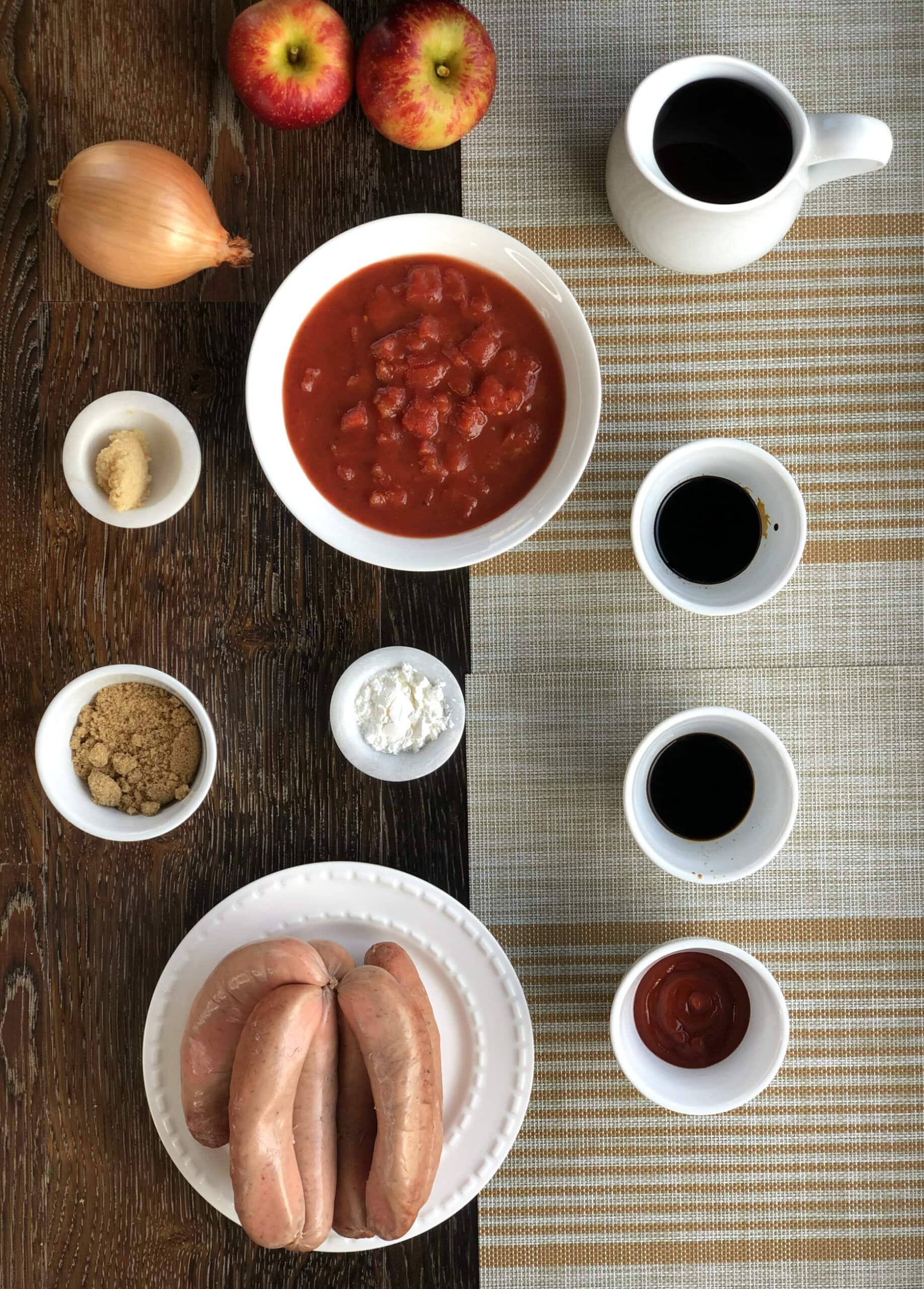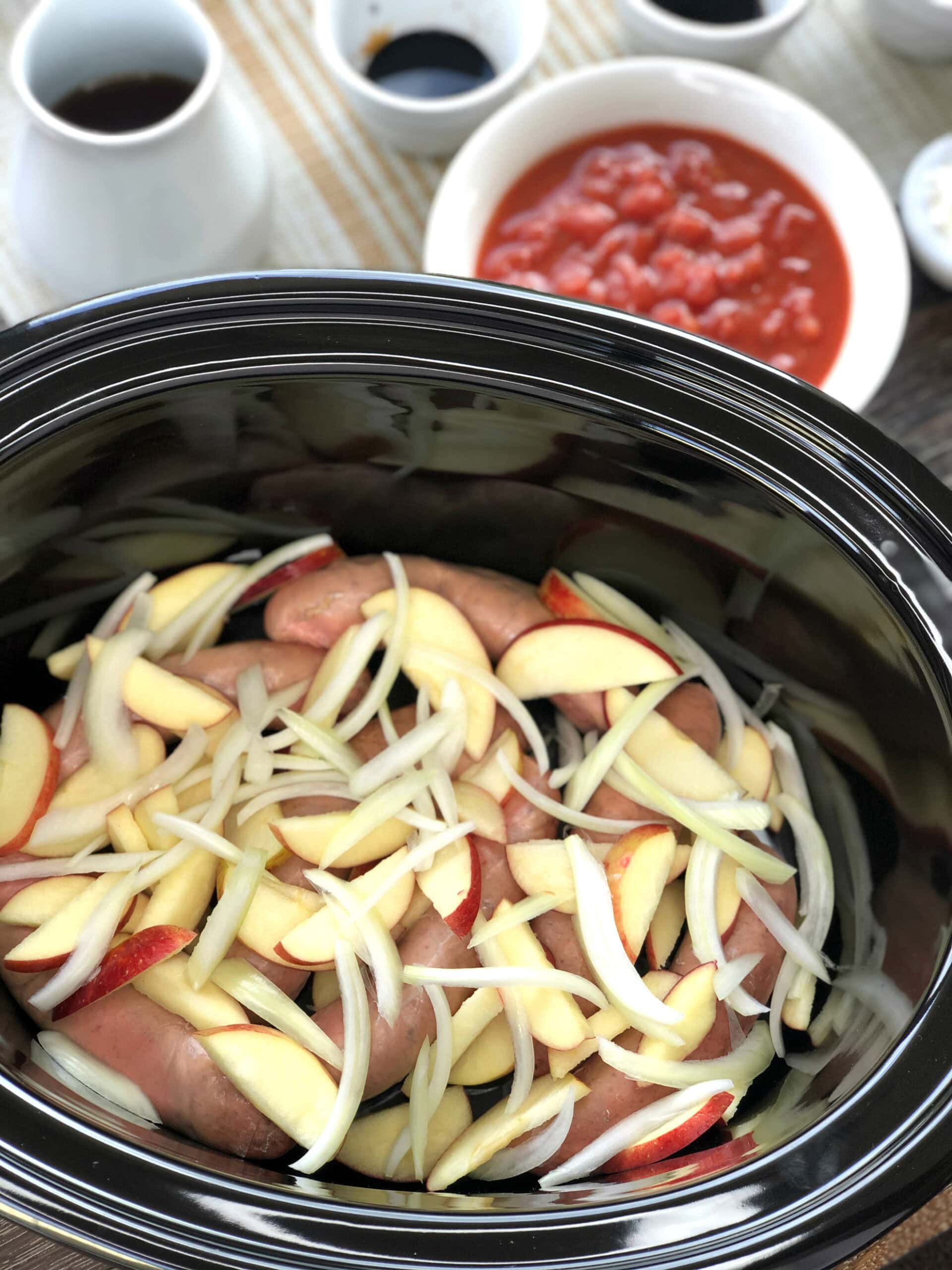 - Place the sausages, sliced onion and sliced apple into the slow cooker