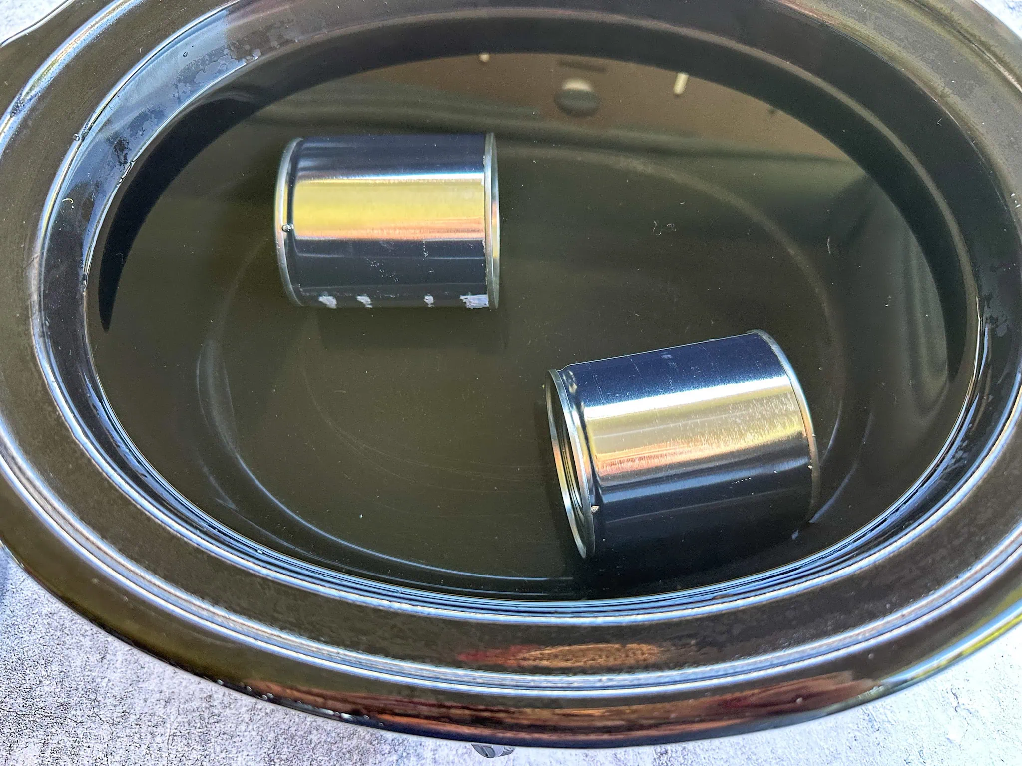 - Lay the cans on their sides in the bottom of your slow cooker and cover completely in water, cover with at least 4-5cm of water above the height of the cans, I fill my slow cooker to nearly full.