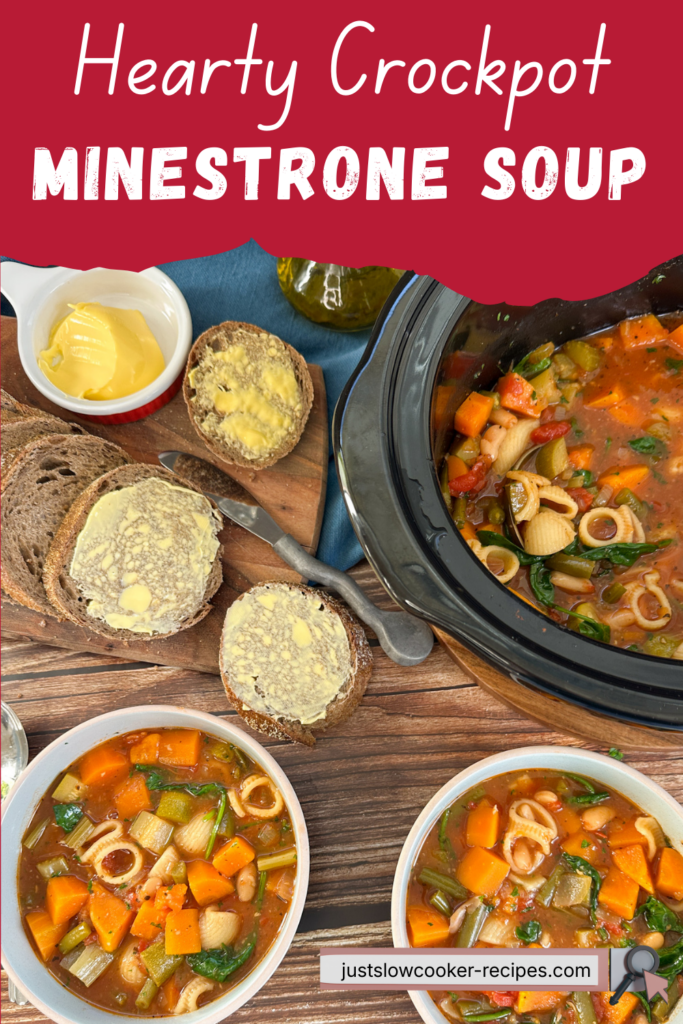 This slow cooker minestrone soup is a wonderfully comforting meal filled with vegetables, beans and pasta in a rich tomato broth, that’s perfect for busy days.